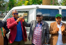 Mkuu wa mkoa wa Arusha, Mhe. John V.K Mongella amemkabidhi funguo za gari, aina ya Toyota Land Cruser - Ambulance, Mbunge wa Jimbo la Ngorongoro Mhe. Emmanuel Ole Shangay, wakati wa hafla fup...