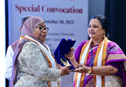 Rais wa Jamhuri ya Muungano wa Tanzania Mhe. Samia Suluhu Hassan akitunukiwa Shahada ya Heshima ya Udaktari wa Falsafa (Honoris Causa) na Makamu Mkuu wa Chuo Kikuu cha Jawaharlal Nehru Profesa Santish...